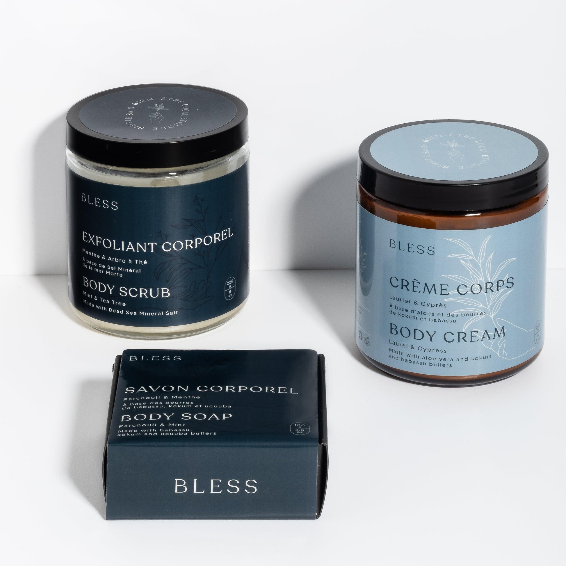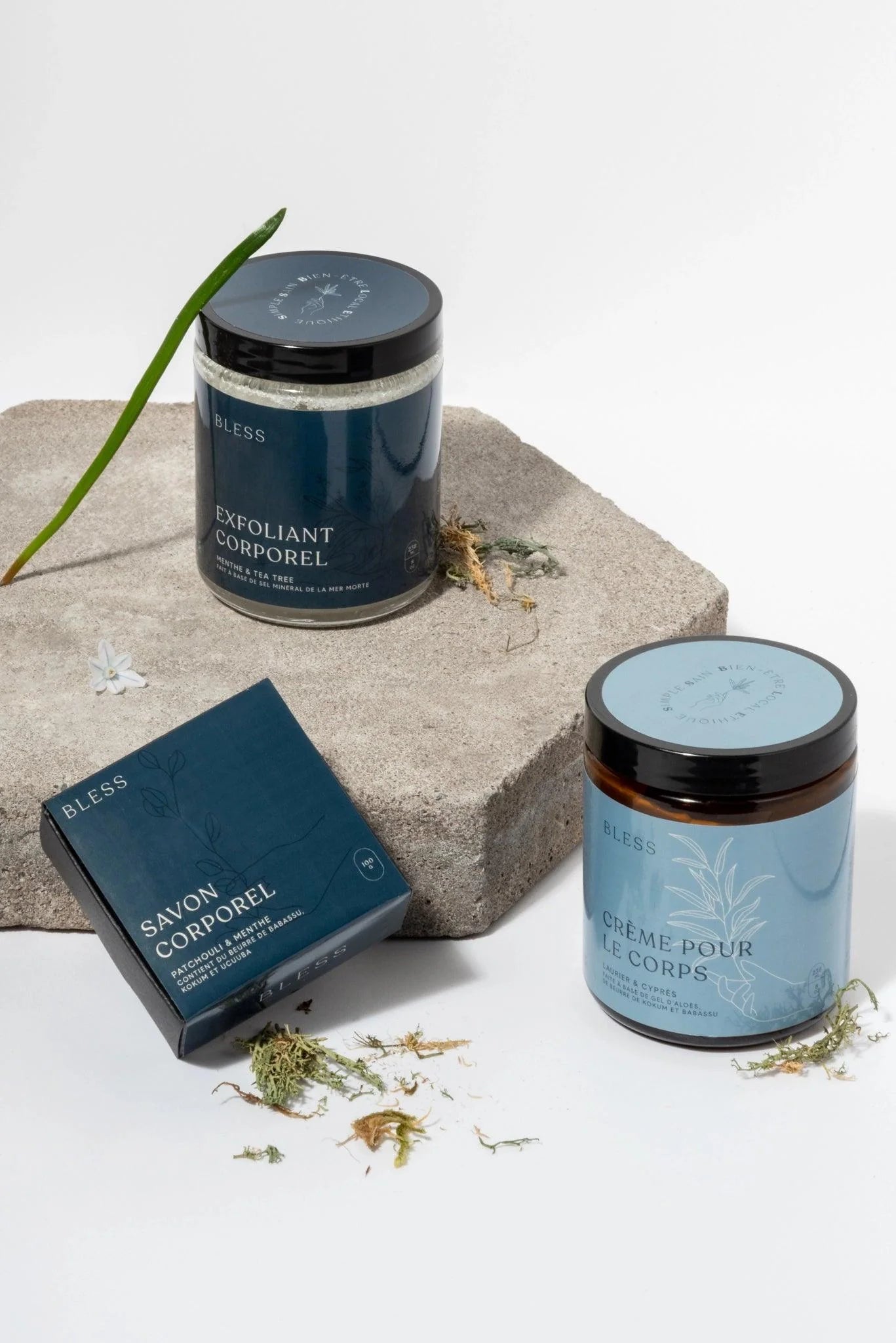 Découvrez notre ensemble soins du corps herbacé pour une expérience aux odeurs fraîches et mentholées. Cet ensemble comprend le savon Patchouli & Menthe, l'exfoliant Menthe & Arbre à Thé et la crème Laurier & Cyprès. Profitez d'une routine de soins complète inspirée de la nature.
