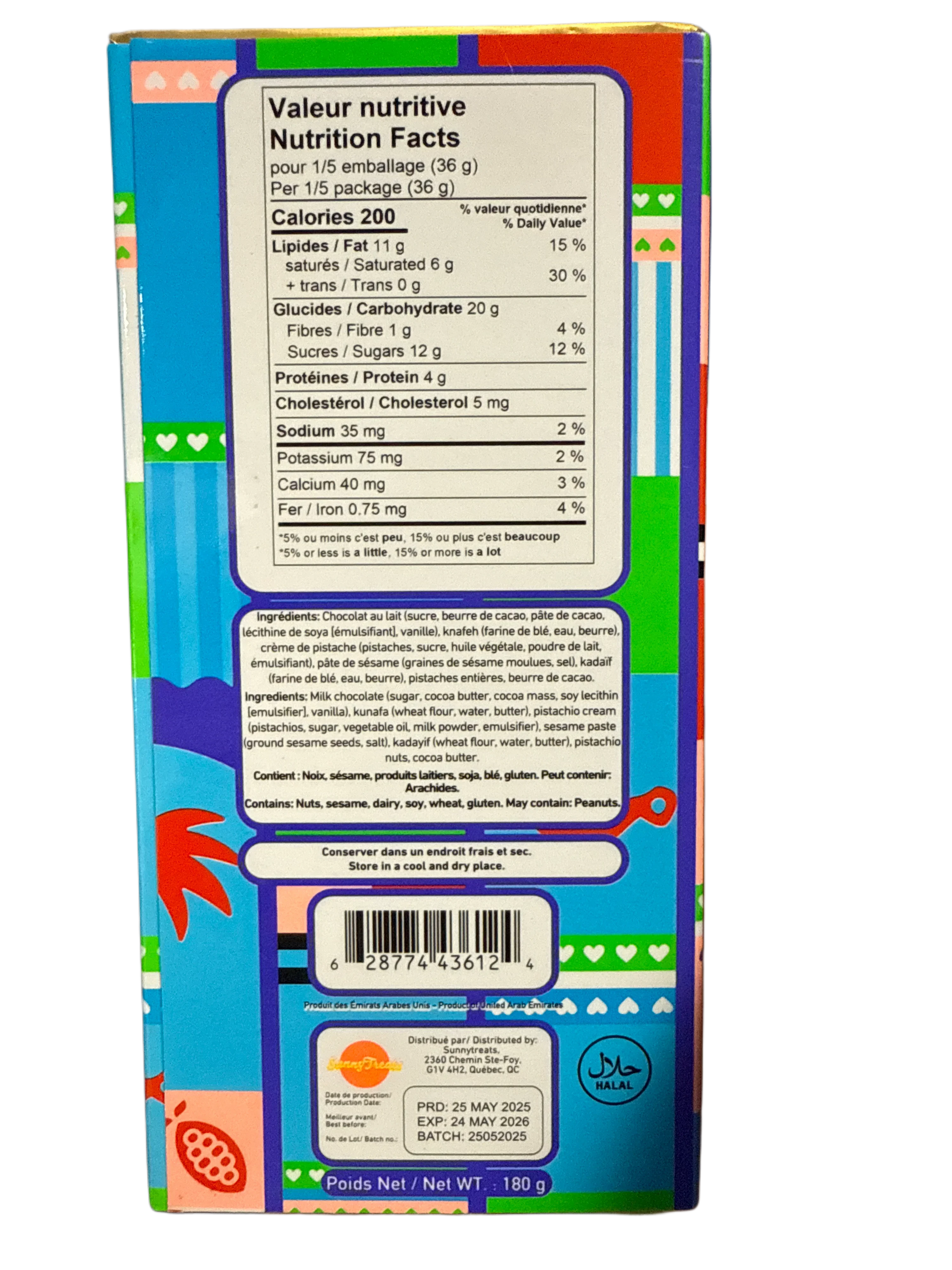 Découvrez la fusion unique de saveurs arabes traditionnelles et de plaisir moderne avec le chocolat Habibi Dubai barbe à papa arabe. Cette délicatesse de 200 g Édition de Dubaï combine la douceur légère et aérienne de la barbe à papa avec un chocolat riche et onctueux, offrant une gâterie raffinée qui reflète la culture vibrante de Dubaï. Parfait pour les connaisseurs recherchant une expérience gustative authentique qui équilibre patrimoine et innovation à chaque bouchée.